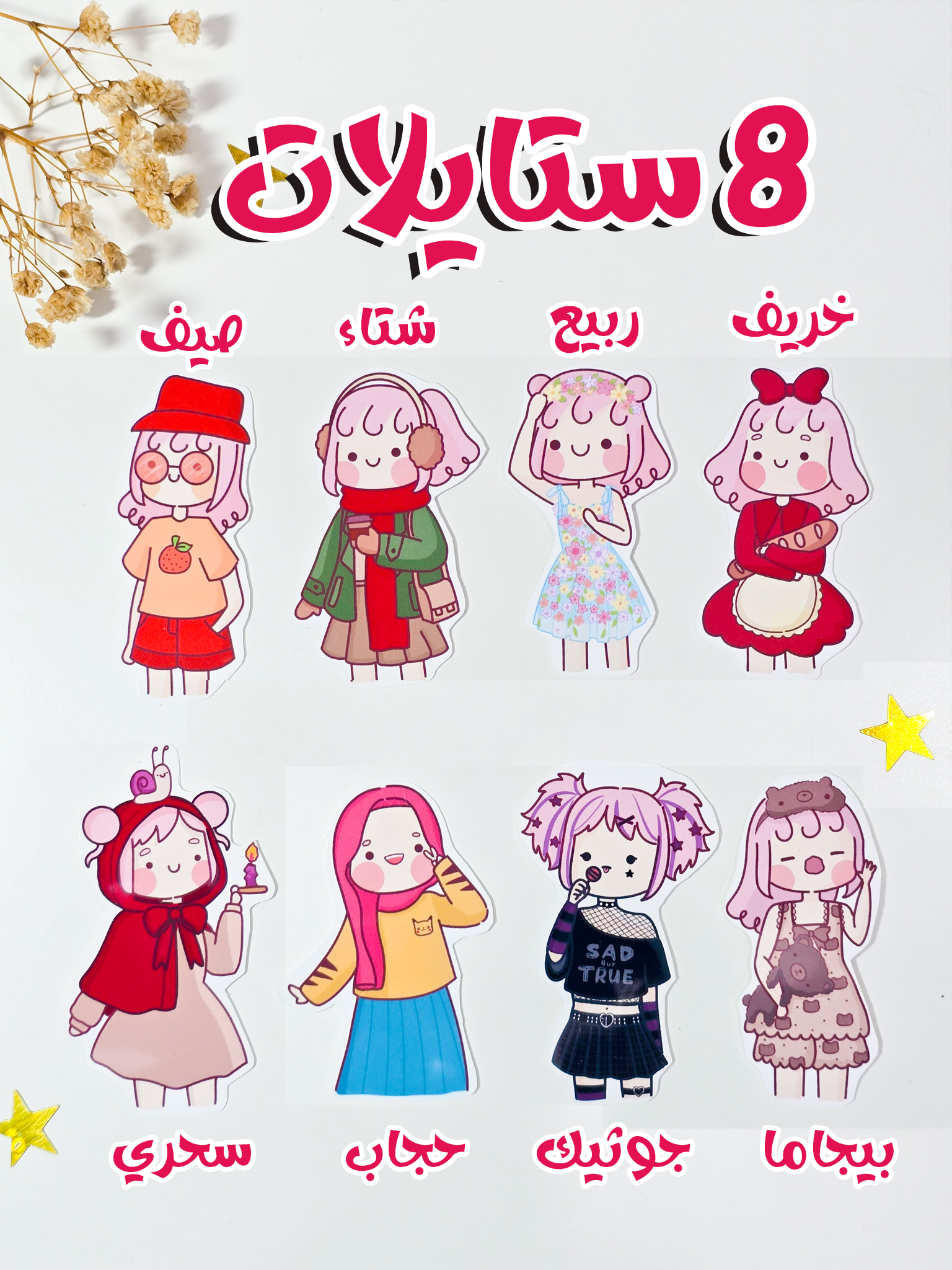 المجموعة مكونة من ٨ ستيكرات مقصوصة يدويا