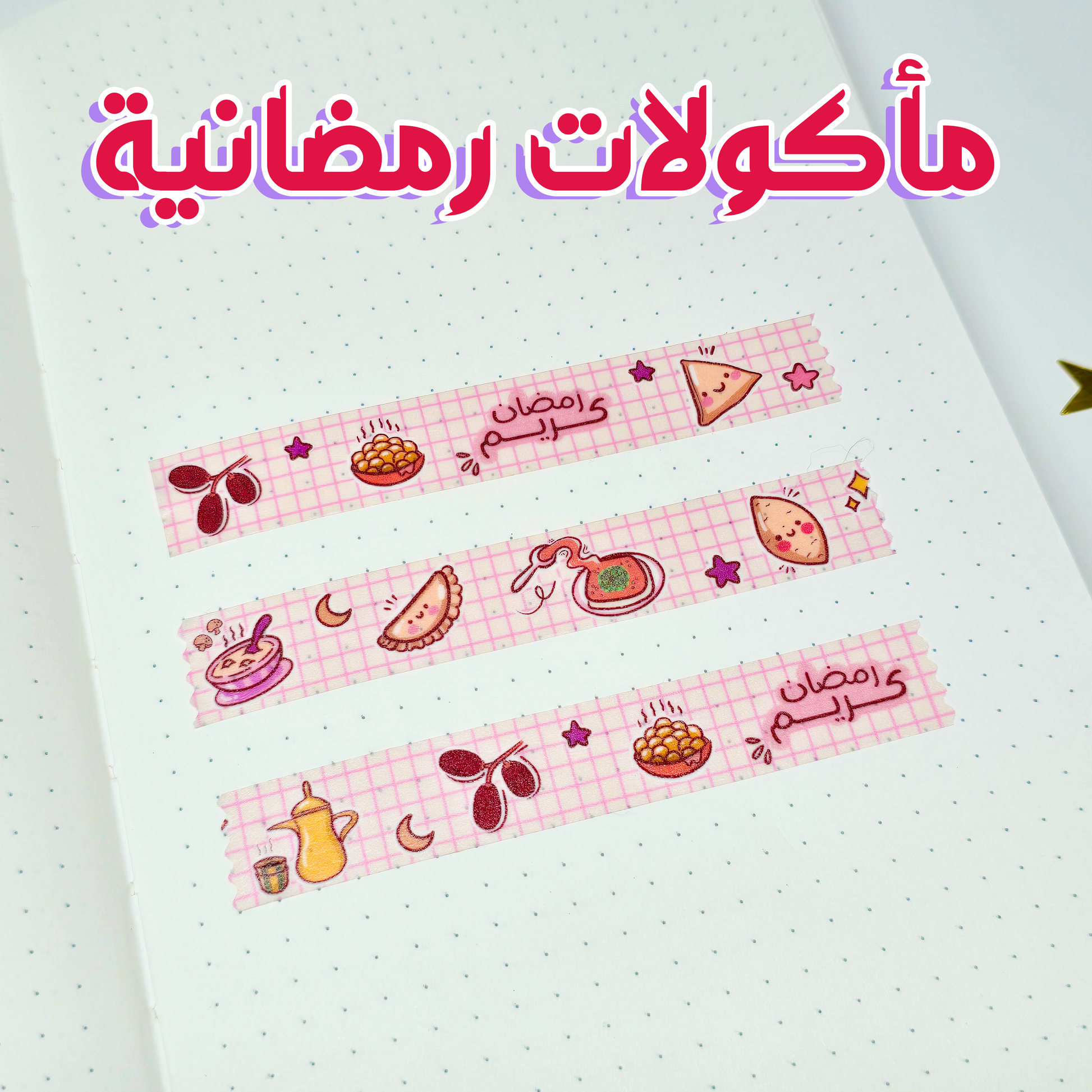 واشي تيب برسومات مأكولات رمضان مثل القطائف، التمر، الكبة، العوامة، القهوة، سمبوسة